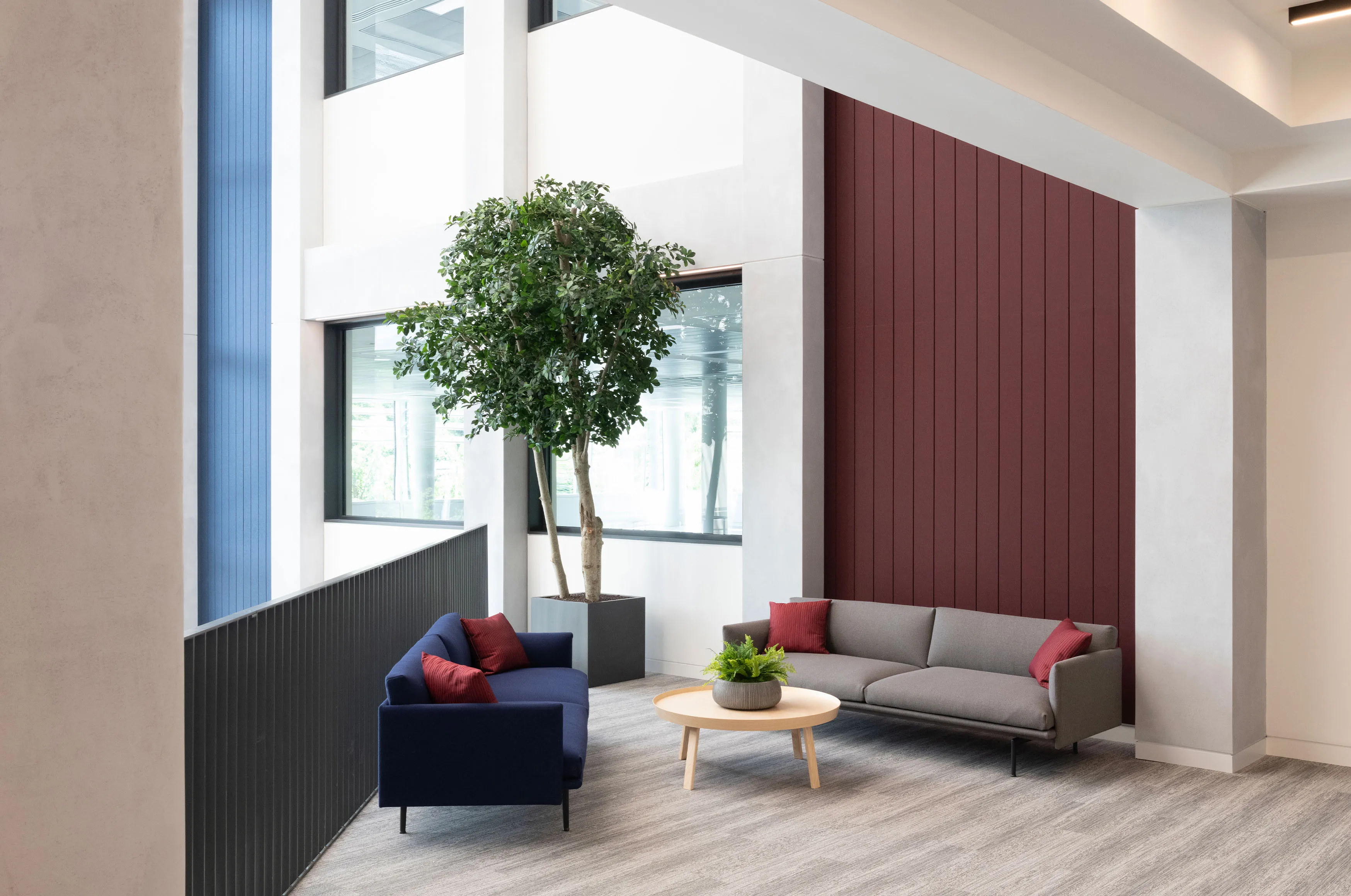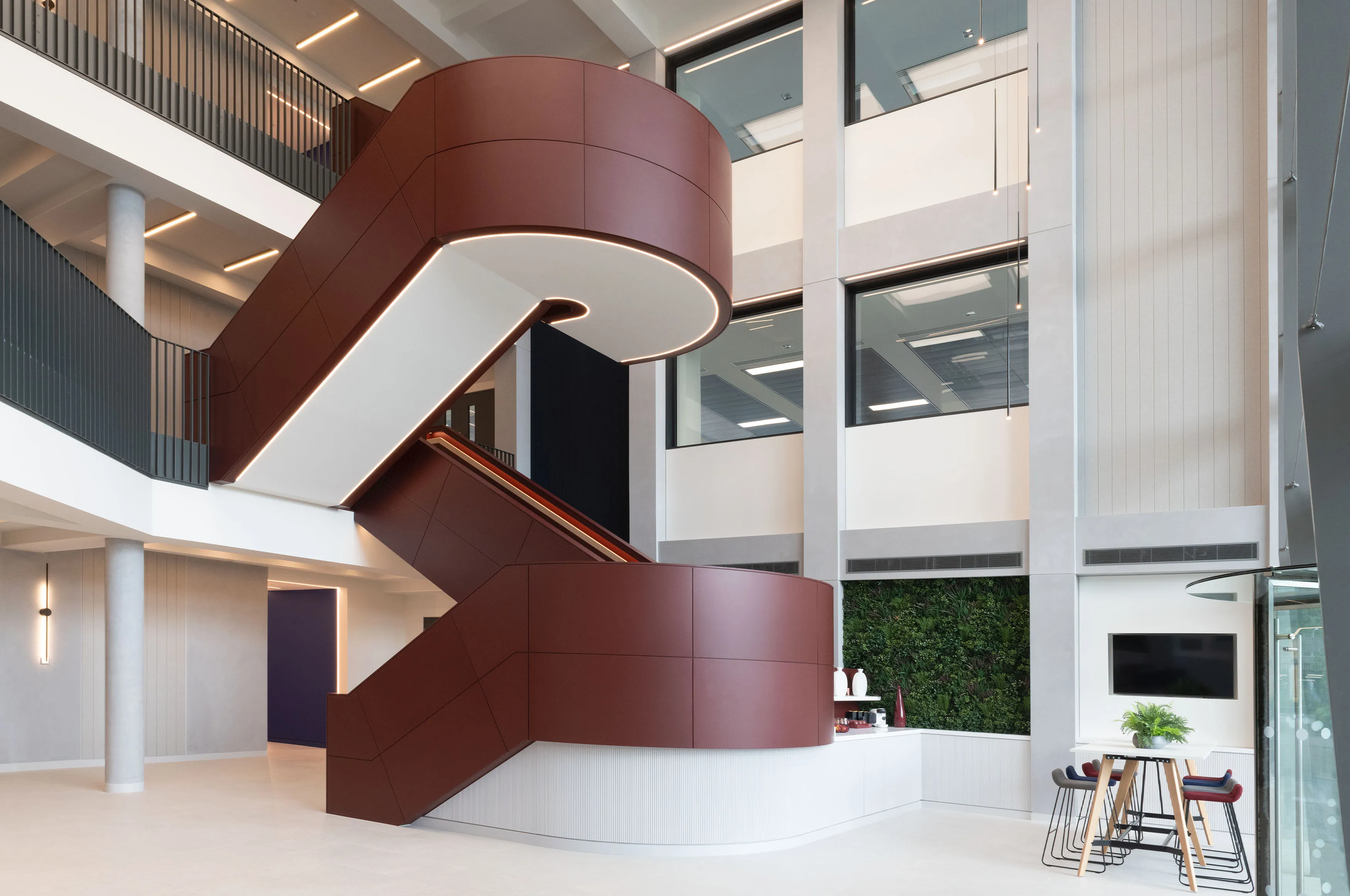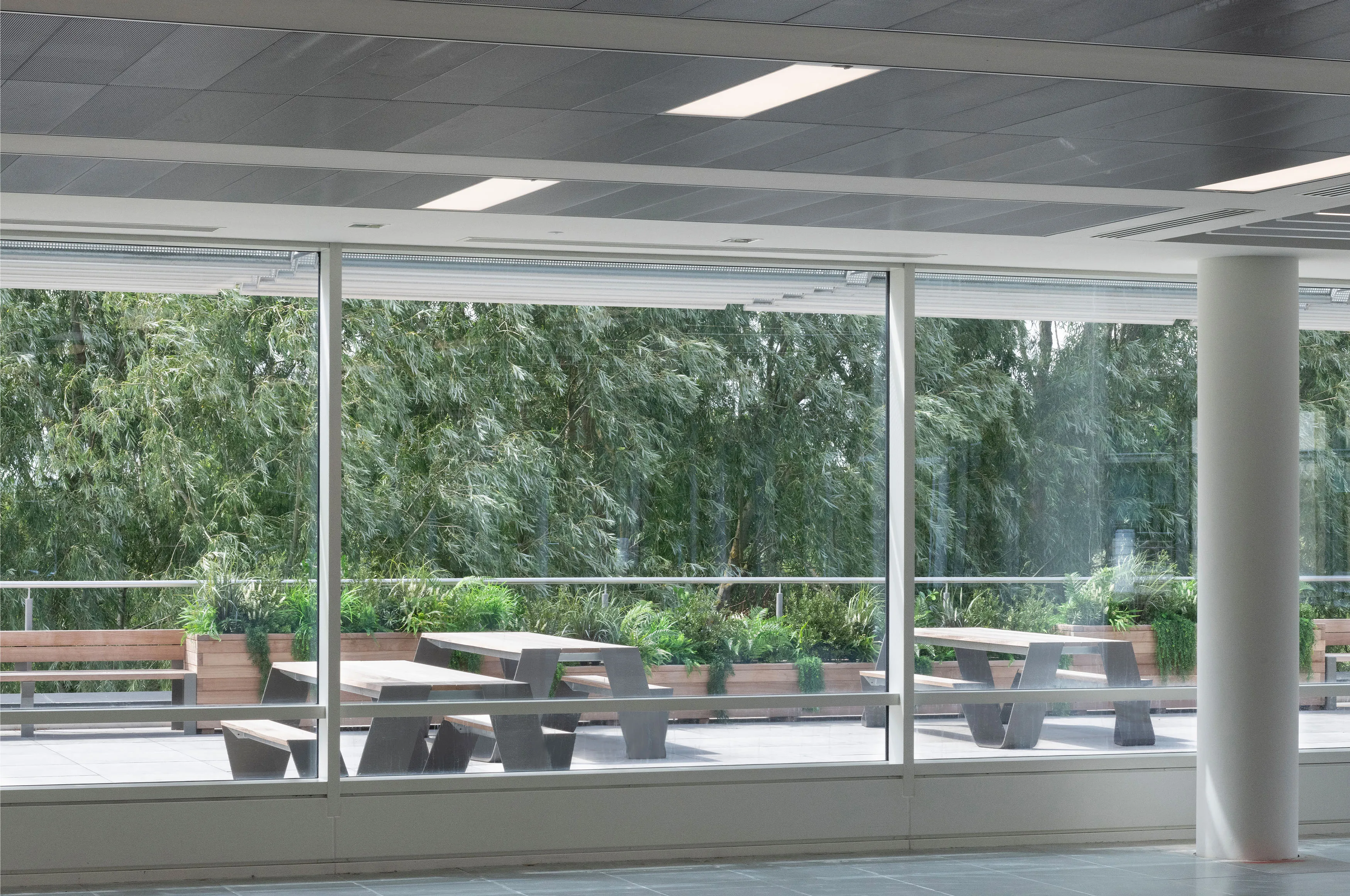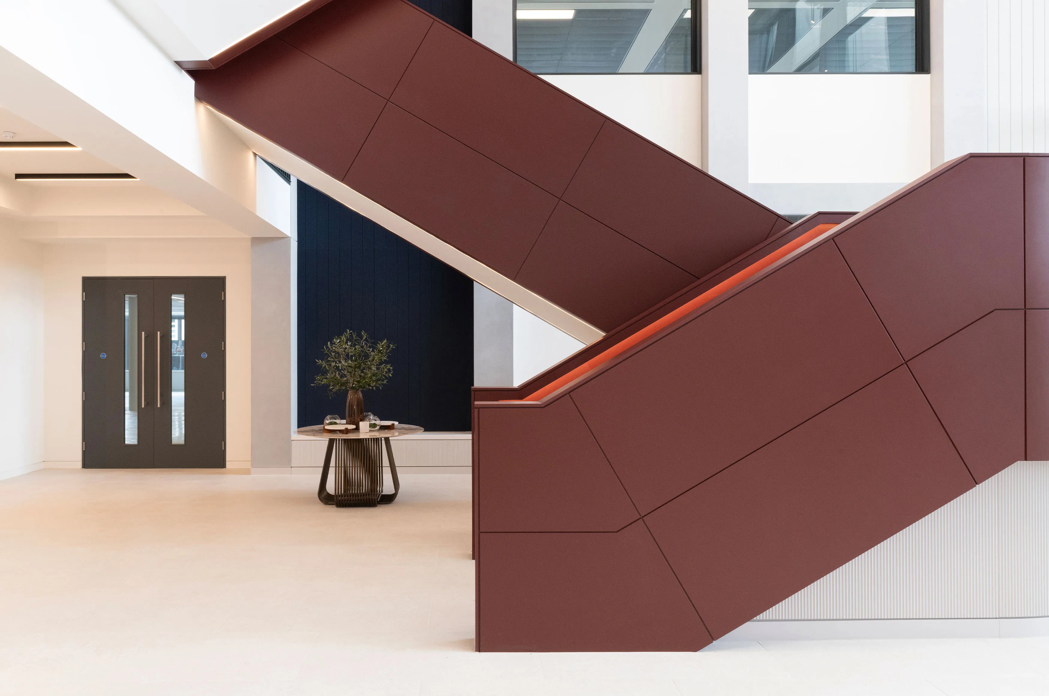 The design team had to think innovatively to improve the building’s credentials to future standards. All mechanical and electrical services were stripped out and replaced with high efficiency water based Air Source Heat Pumps (ASHPs) and ventilation systems with heat recovery units, removing all refrigerant gases from the building. This was supplemented with significant solar panels on the extensive flat roof. Floors were fully stripped back and upgraded with new modern sustainable ventilation and heating/cooling systems. Lighting was upgraded throughout to LED panels slotted into bespoke bays of perforated hybrid ceiling planks.