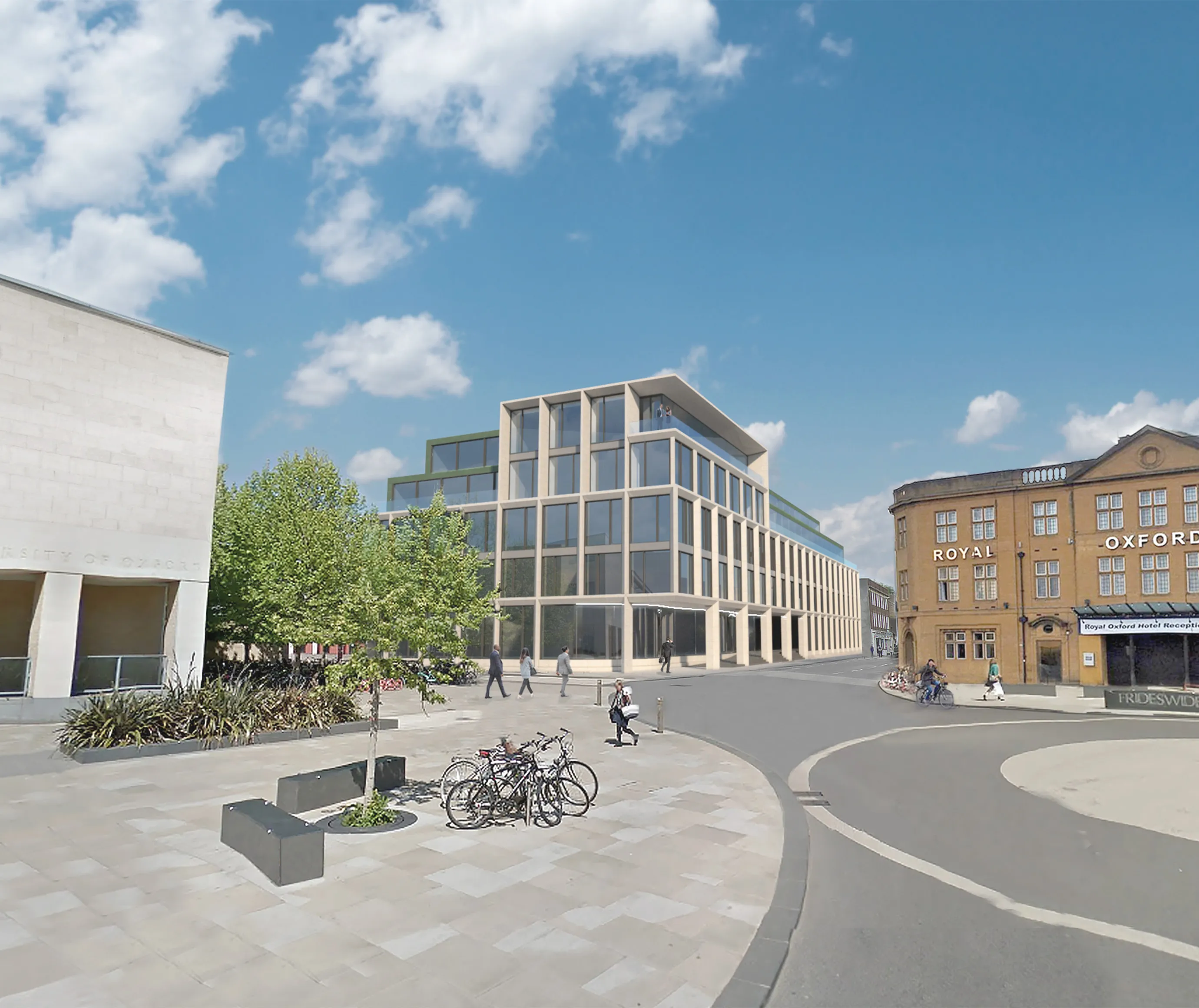 A new fully glazed asymmetric curtain wall creates a contrast to the Oxford stone grid of the existing building. This will be augmented with bronze cladding, creating a distinctive feature and a counterpoint to the neighbouring Saïd Business School. A chamfered façade looks on to Frideswide Square and the approach from the train station, linking the proposal to the wider Osney Mead and Oxpens development in west Oxford.