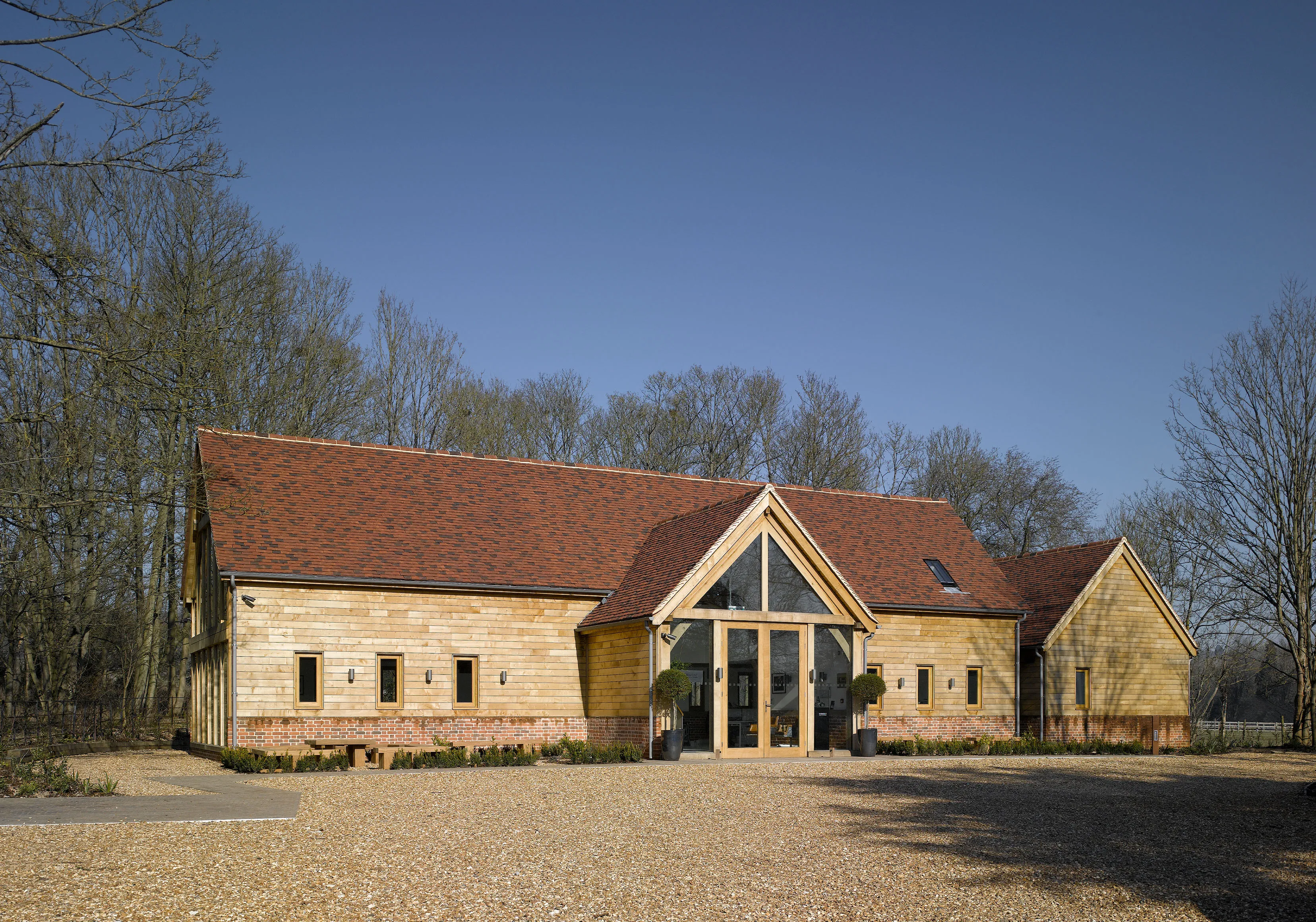 New build headquarters on agricultural land and within an Area of Outstanding Natural Beauty (AONB), with the addition of 2000 new oak, beech and lime trees and 200m of mixed hedgerow.