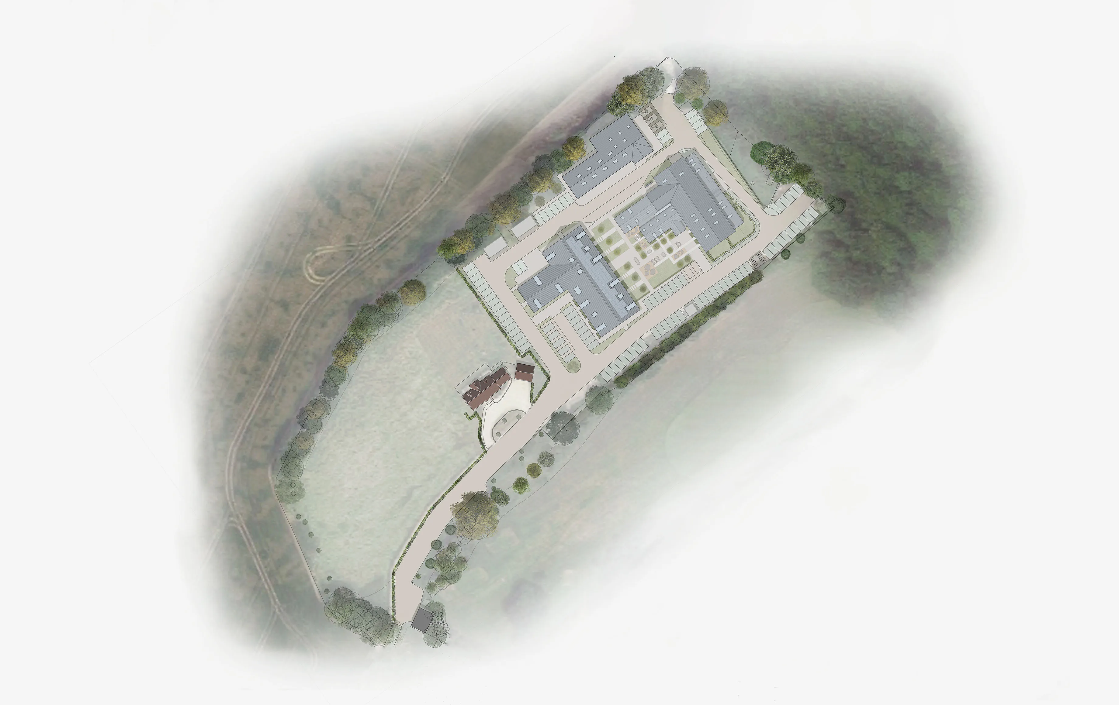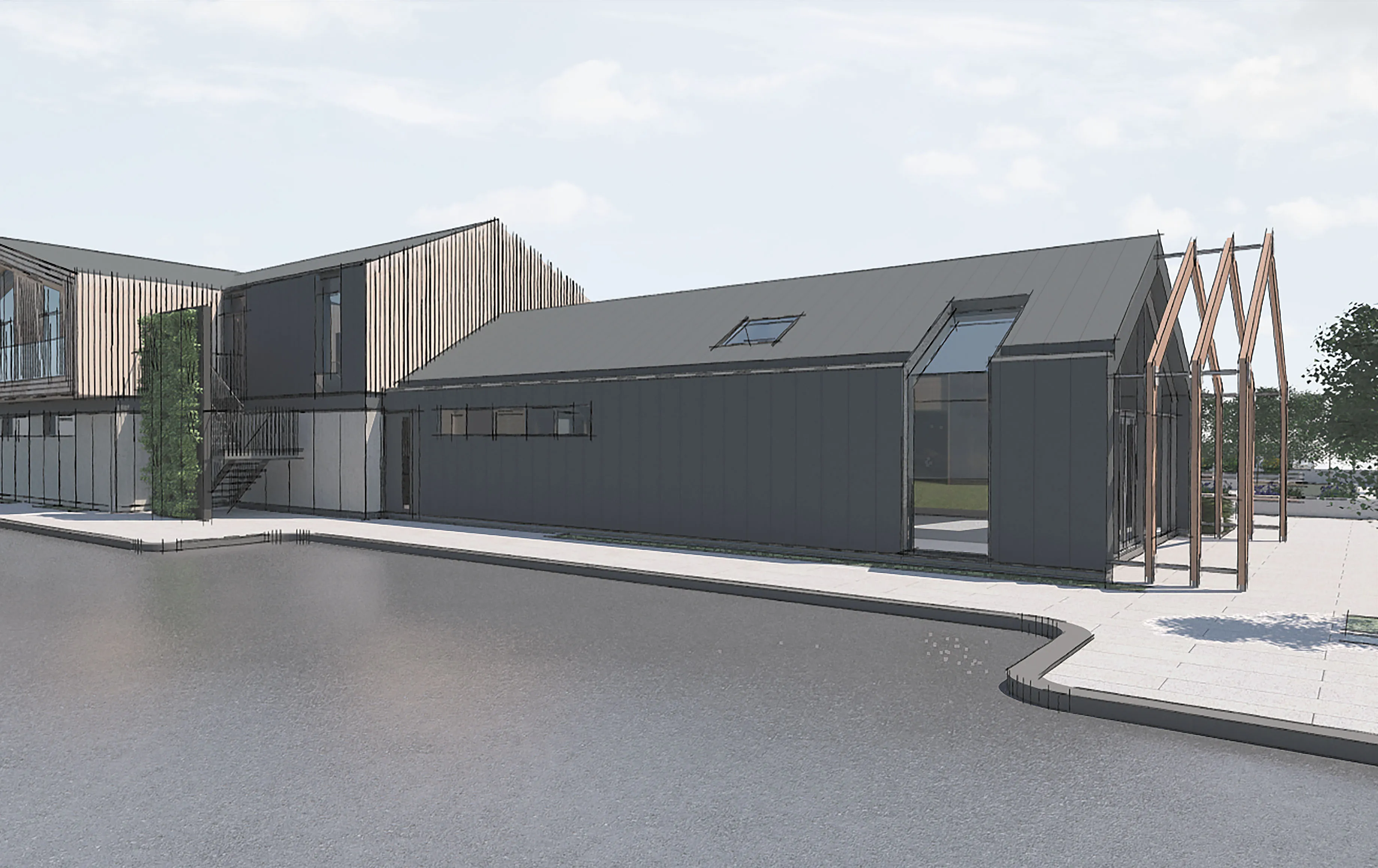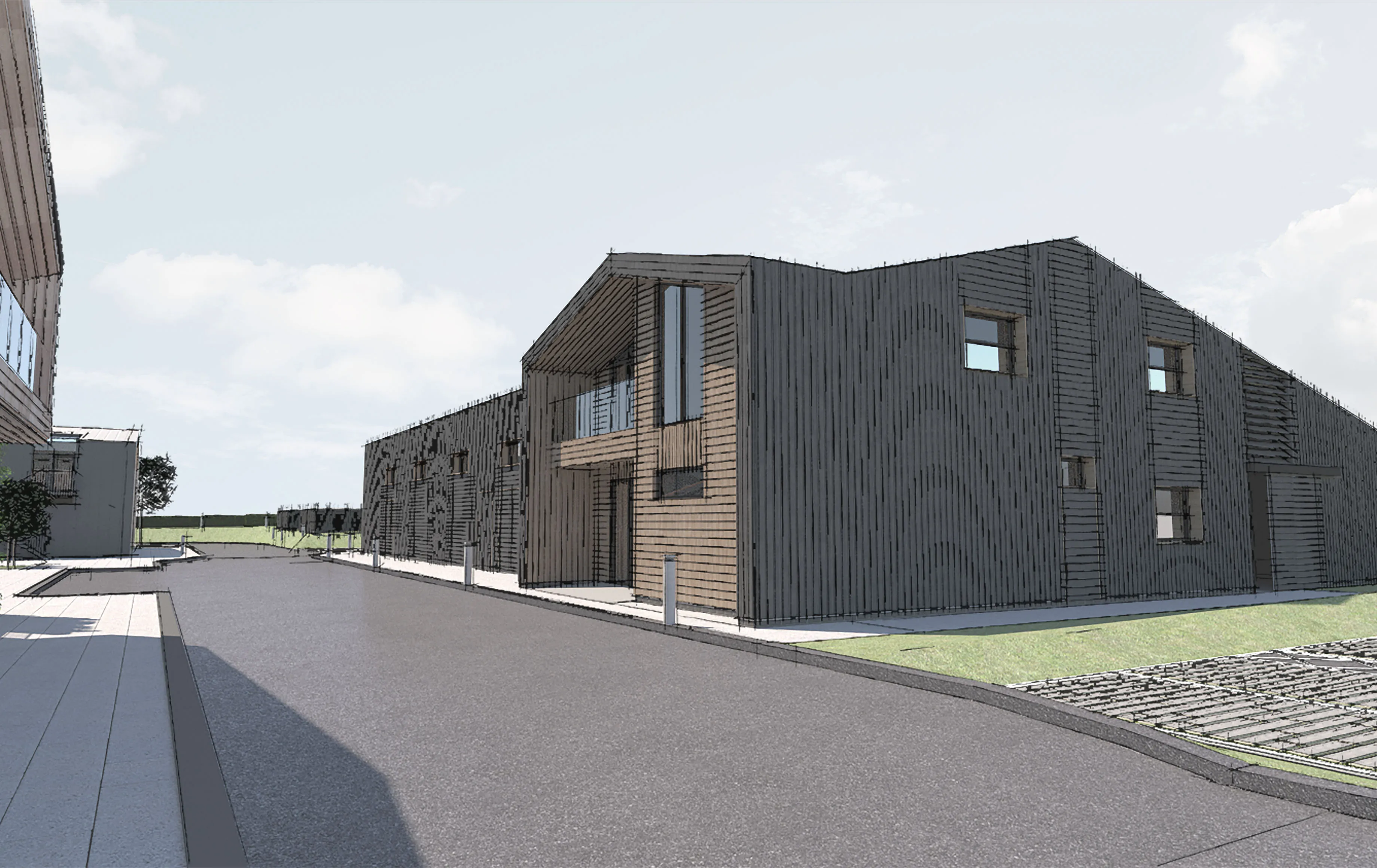 The new small animal hospital is more unusual and resembles the cattle barns and sheds that stand on the existing site. We worked closely with the tenant-to-be, a veterinary practice, to agree an internal layout for the multi-gabled building. Opposing wings provide separation for the different animals attending the practice and the hospital has many new features, including theatres, dentistry, x-ray and lab spaces, making it one of the top veterinary services in the country. Lightweight cantilevering terraces project from the staff and office spaces on the first floor, where there are also nurse and staff flats to enable 24 hour medical care.