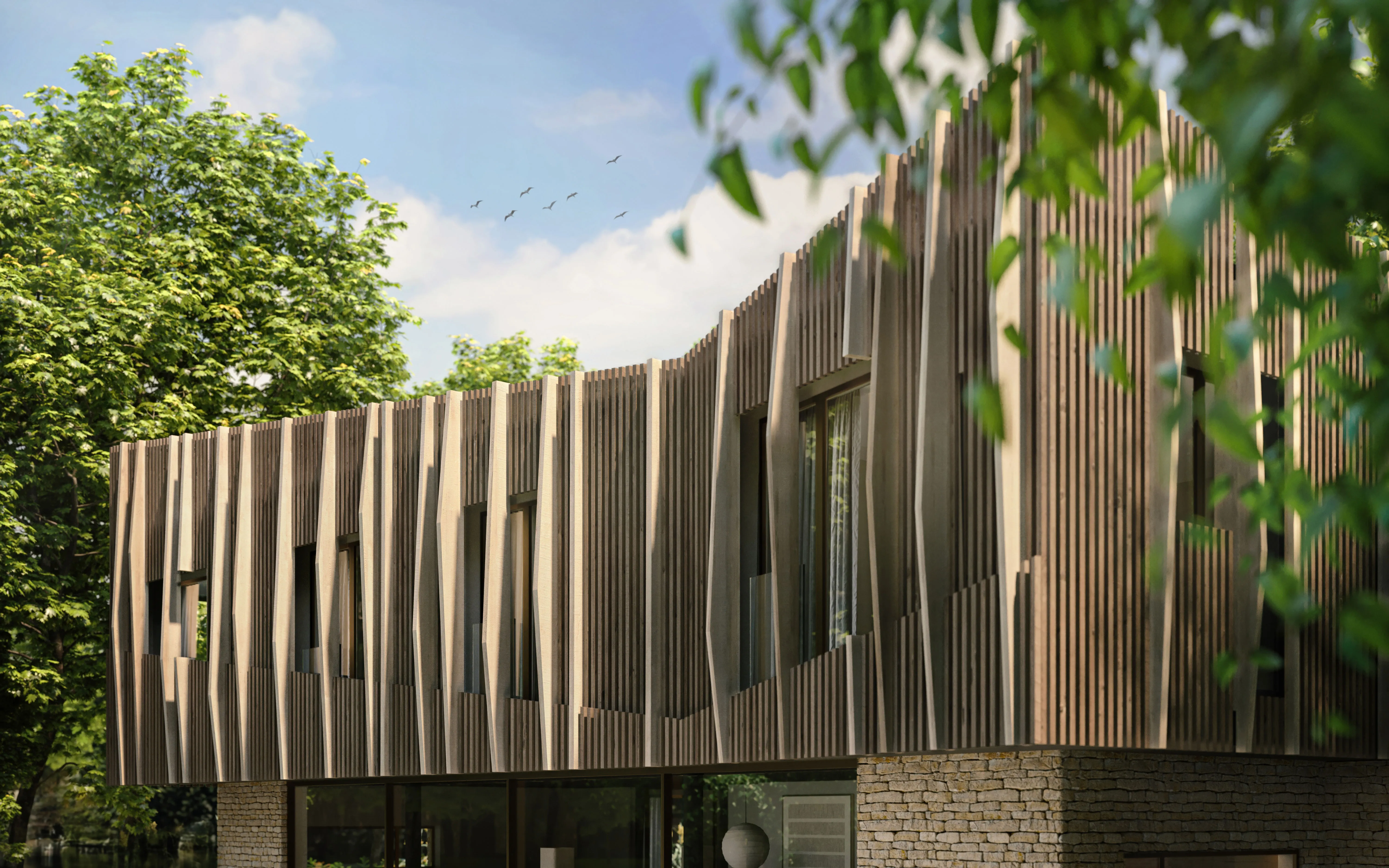 At ground level, the building has a solid, sculptural presence, while the first floor becomes lighter and more open, maximising natural daylight and views across the riverside setting. Cladding extends over the roofline to blend the building into its surroundings, creating a sense of transparency and architectural ‘mimetism’.