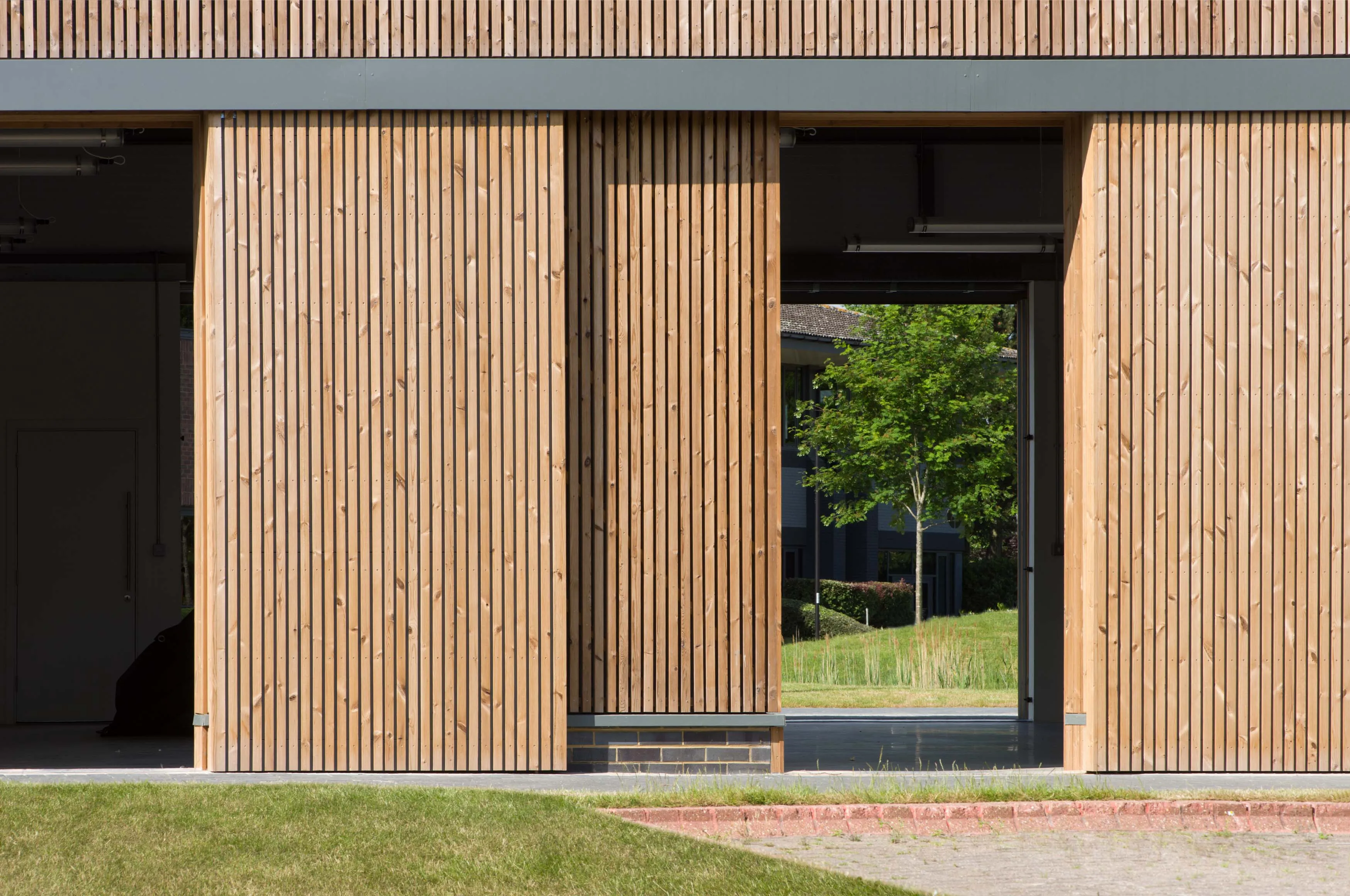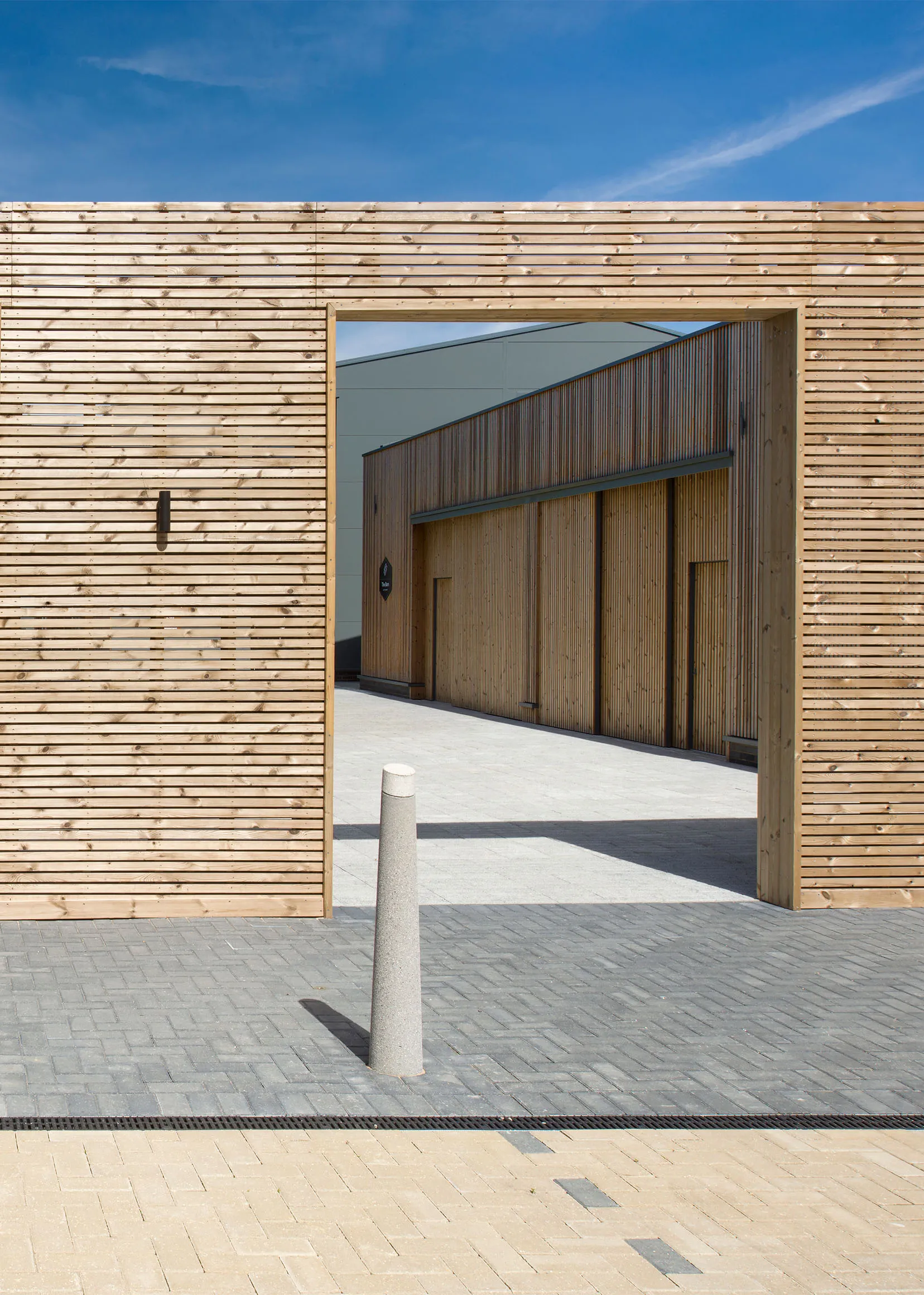 The original plan was for a full conference centre, but we questioned the necessity for this, as all the tenants had their own meeting spaces within their buildings. We settled on a new concept for a much smaller building that could be used for multiple purposes. The barn, café and gym are all clad in Thermowood timber battens. Typically derived from sustainably grown softwood, Thermowood’s longevity, robustness and stability are all improved by a natural process of heat-treatment, which elevates its characteristics to the level of a more expensive hardwood.