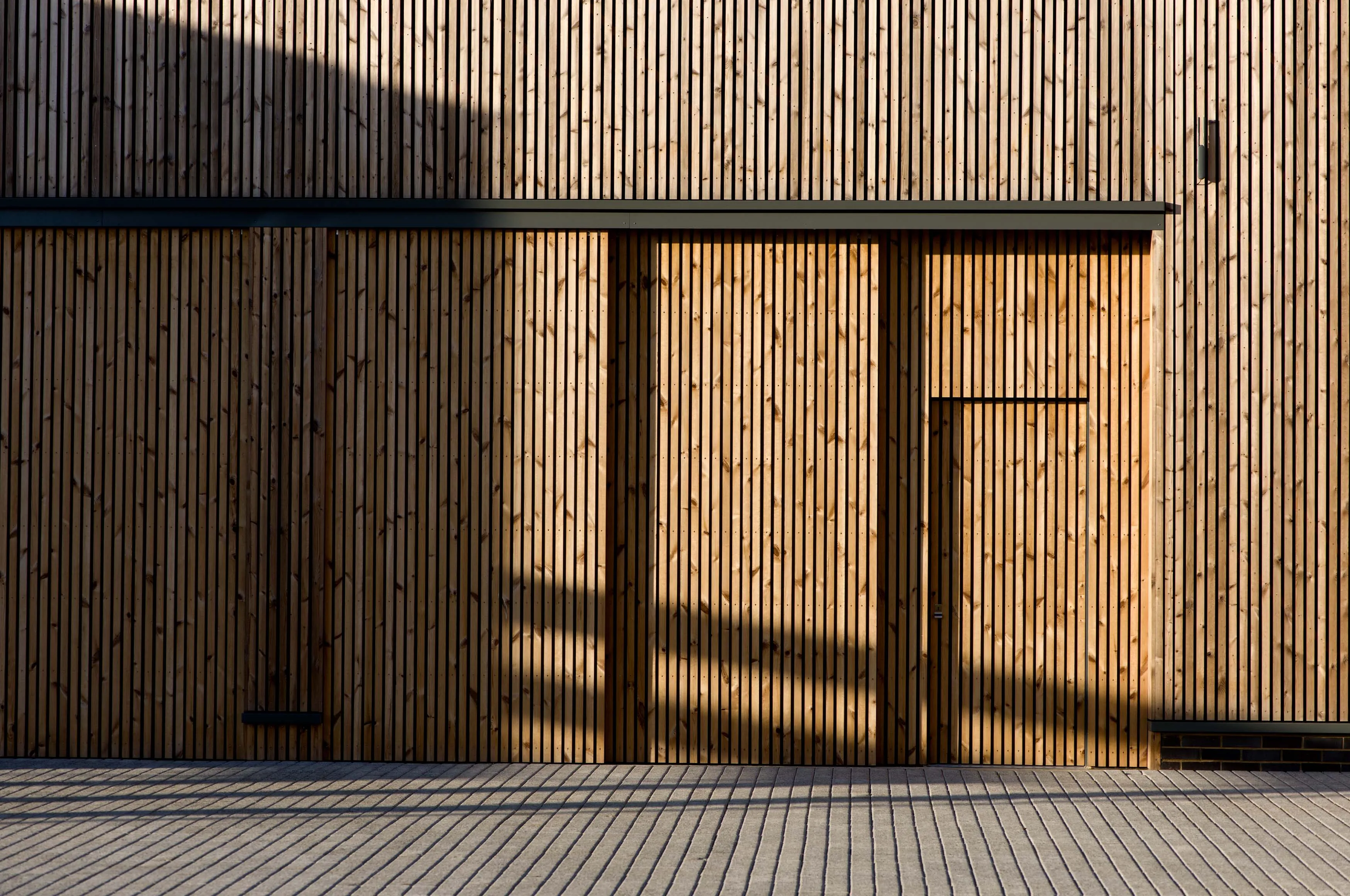 The courtyard overlooking the lake is a communal and versatile area, equipped with power supplies for street food, catering and music. The space is framed by walls of Thermowood battens, here running horizontally as opposed to the vertical cladding on the building, to gently differentiate.
