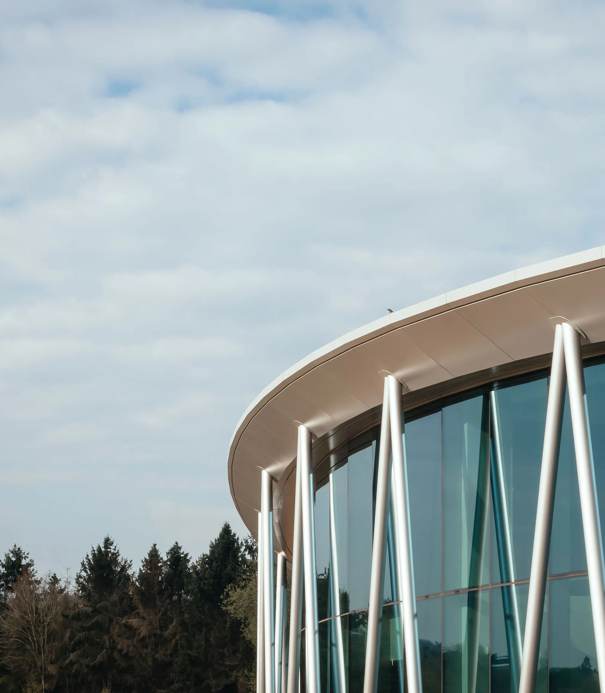 The low slung curved roof is a highly insulated and ecological green roof. Landscaping, commissioned with Andy Sturgeon, will create beautiful external spaces for visitors and employees to enjoy.