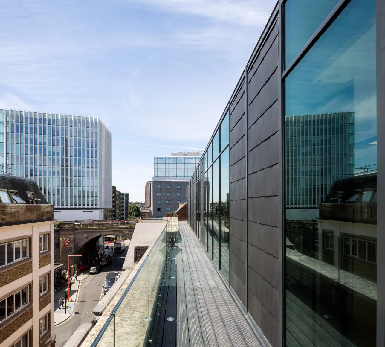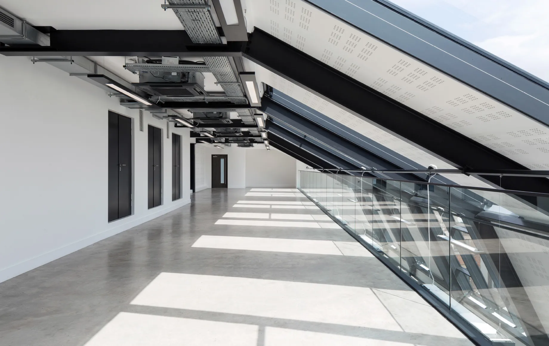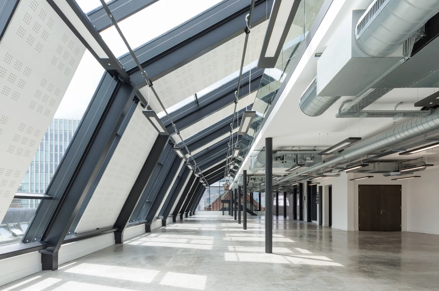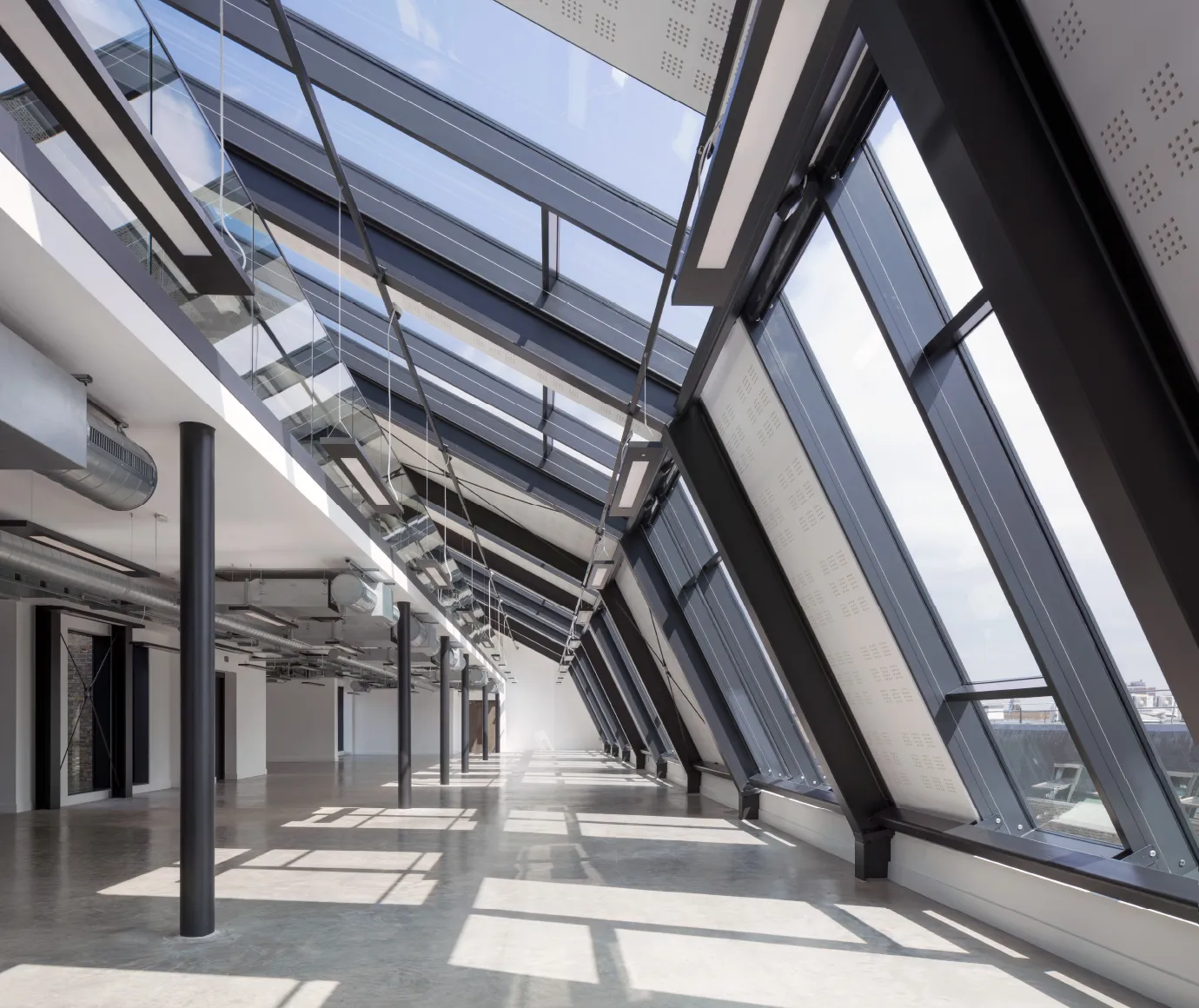 A rooftop addition has gained an additional 634m². It is a lightweight, largely glazed and transparent structure that visually reduces its scale. Whilst its form is sympathetic to the existing building the materials enable it to be read as a distinct later addition rather than a pastiche. Solar shading in the form of solid infill panels reduces the solar gains allowing the south elevation to be environmentally functional and practical internally for tenants.