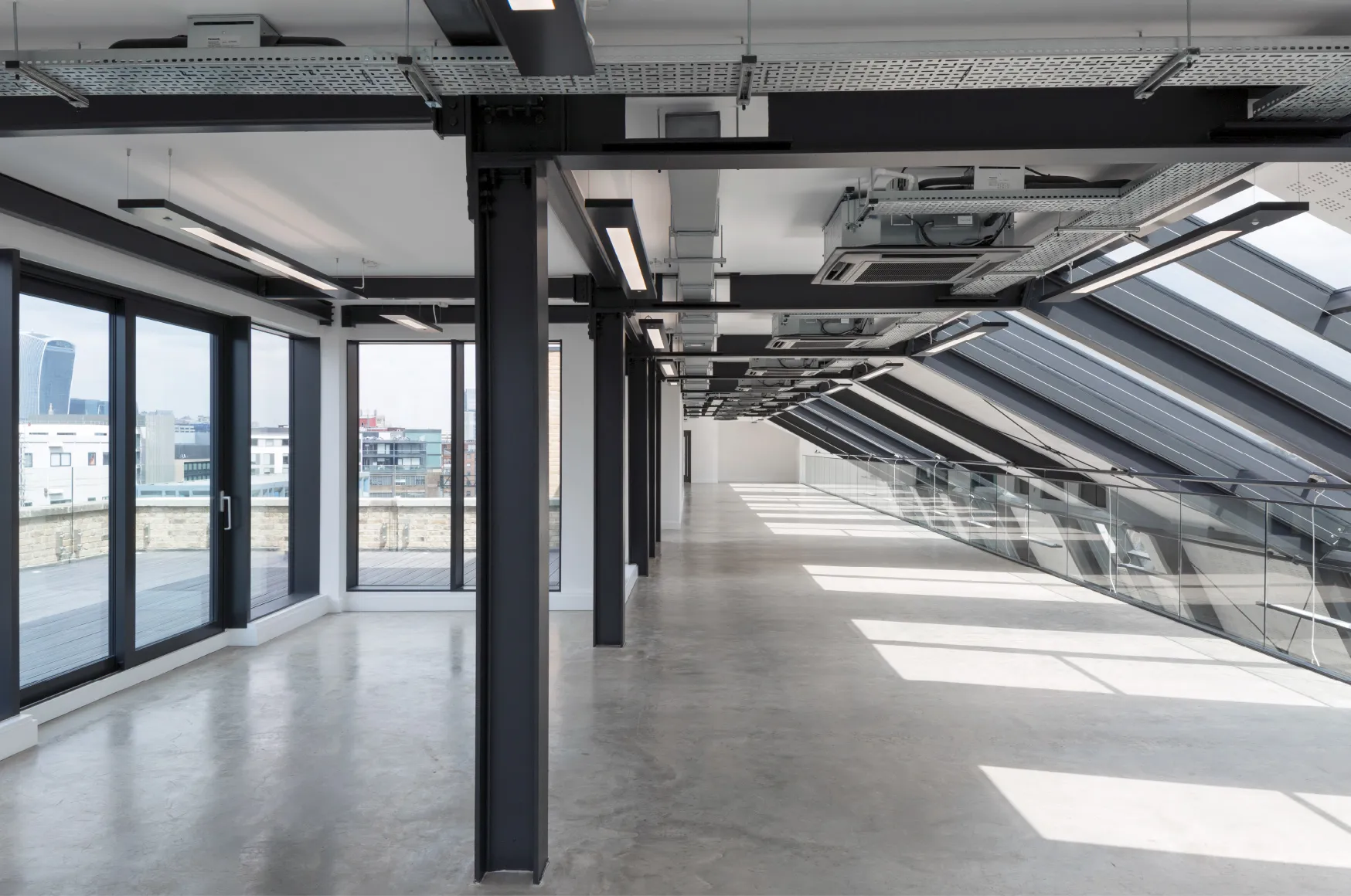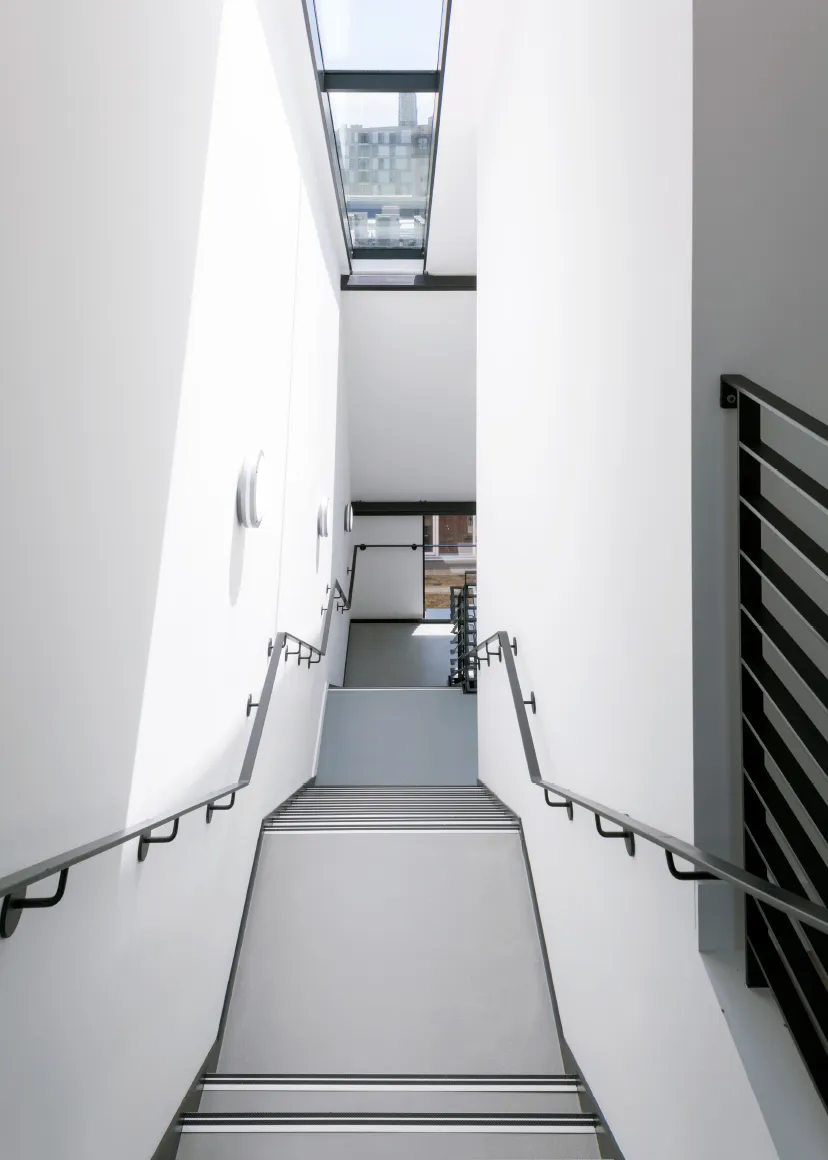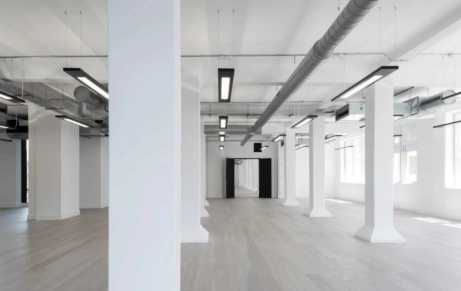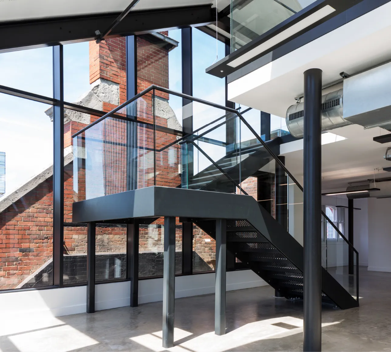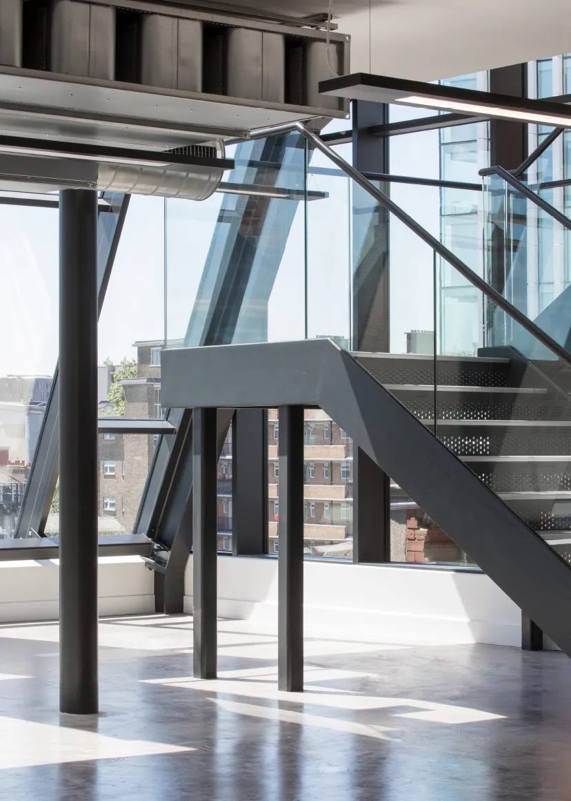 The reception and four floors were refurbished; creating high-specification and energy efficient working environments. The interior design and materials palette is in keeping with the building's history as an industrial warehouse. Reclaimed steel doors and refurbished riveted steel columns mix with clean white interiors to create a contemporary feel. The new reception area, signage and lighting help to brand the building, celebrating its heritage.