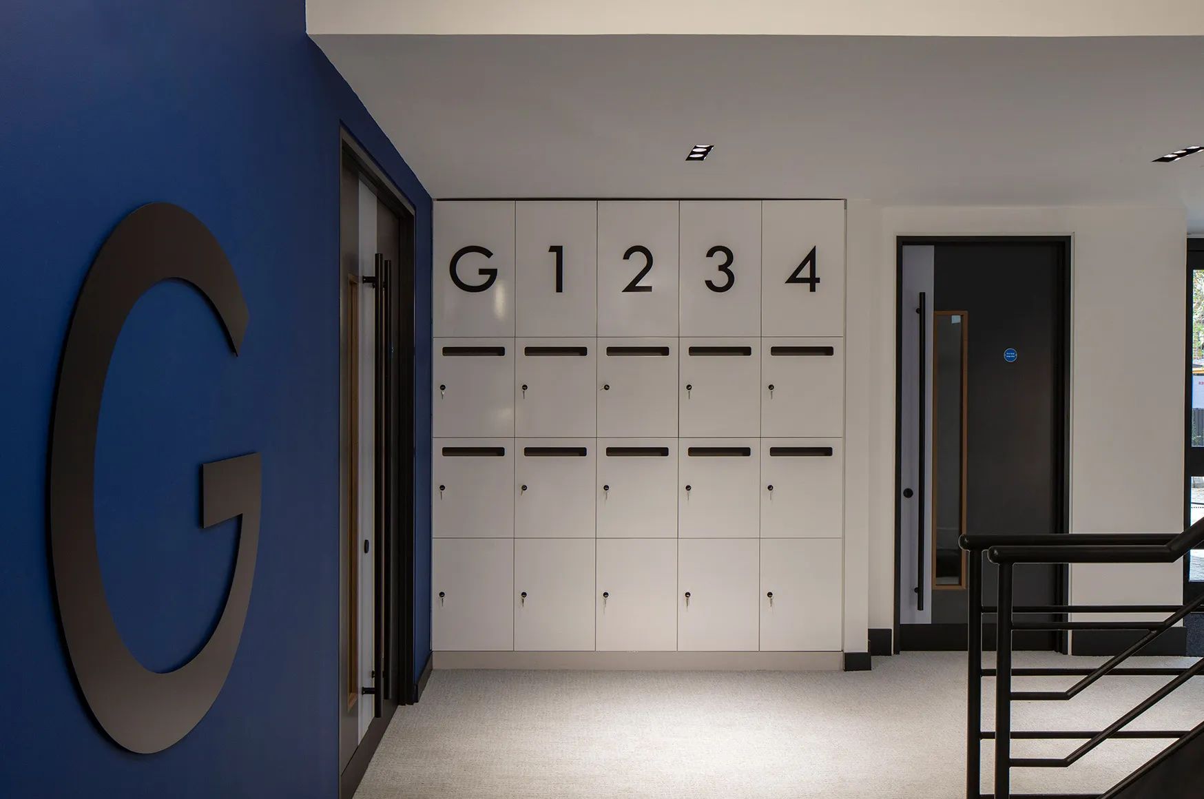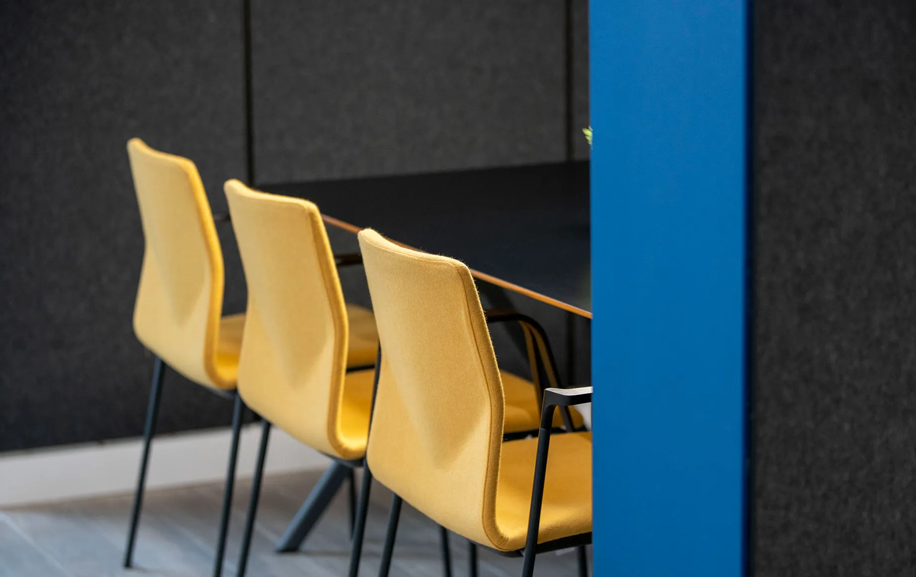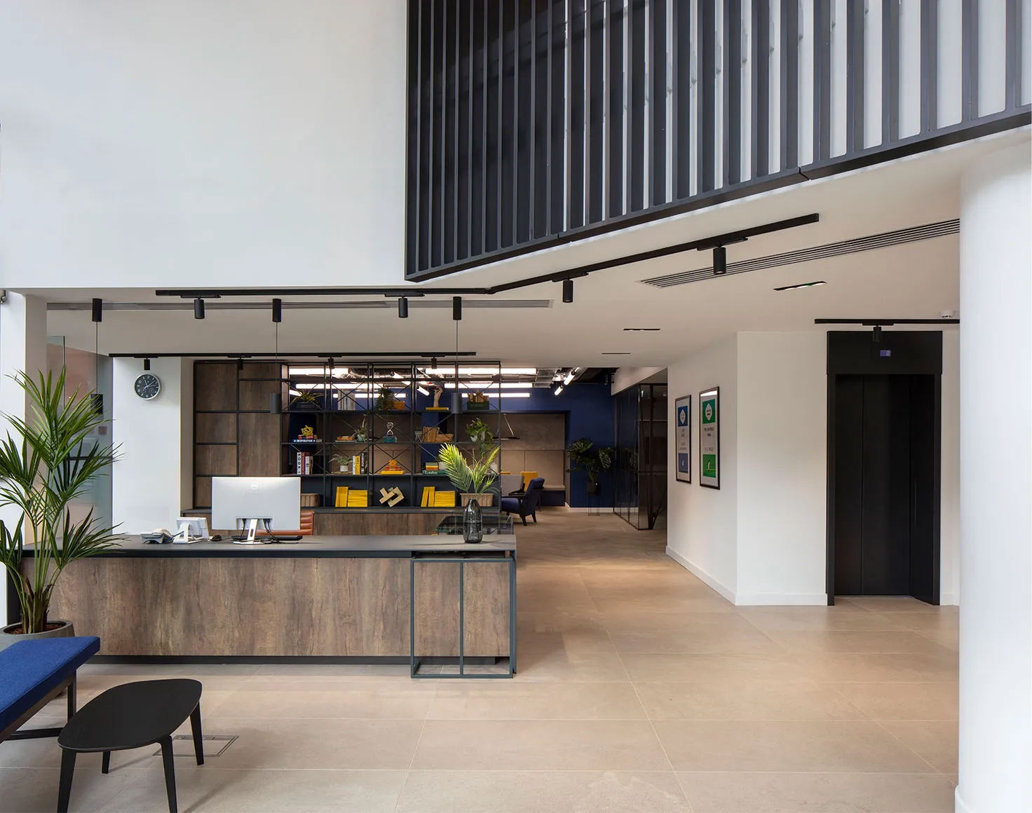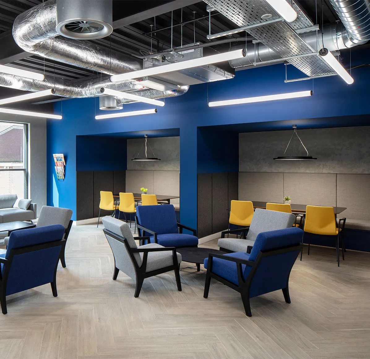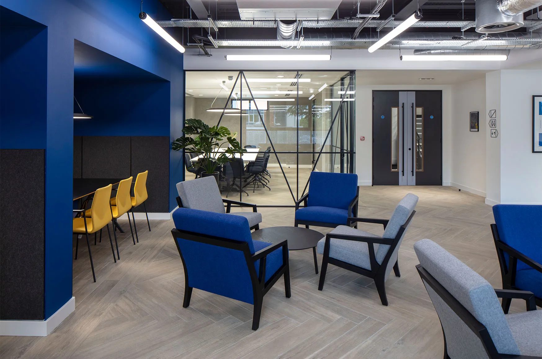 The front entrance has been dramatically improved with a new stepped access from Windsor Road inviting visitors into a fully refurbished and extended reception and collaborative working space. The reception has a private meeting room along with meeting pods and an extensive seating area. Tactile finishes combined with bespoke joinery and select furniture collections populate the double height entrance space and promote interaction and creativity.